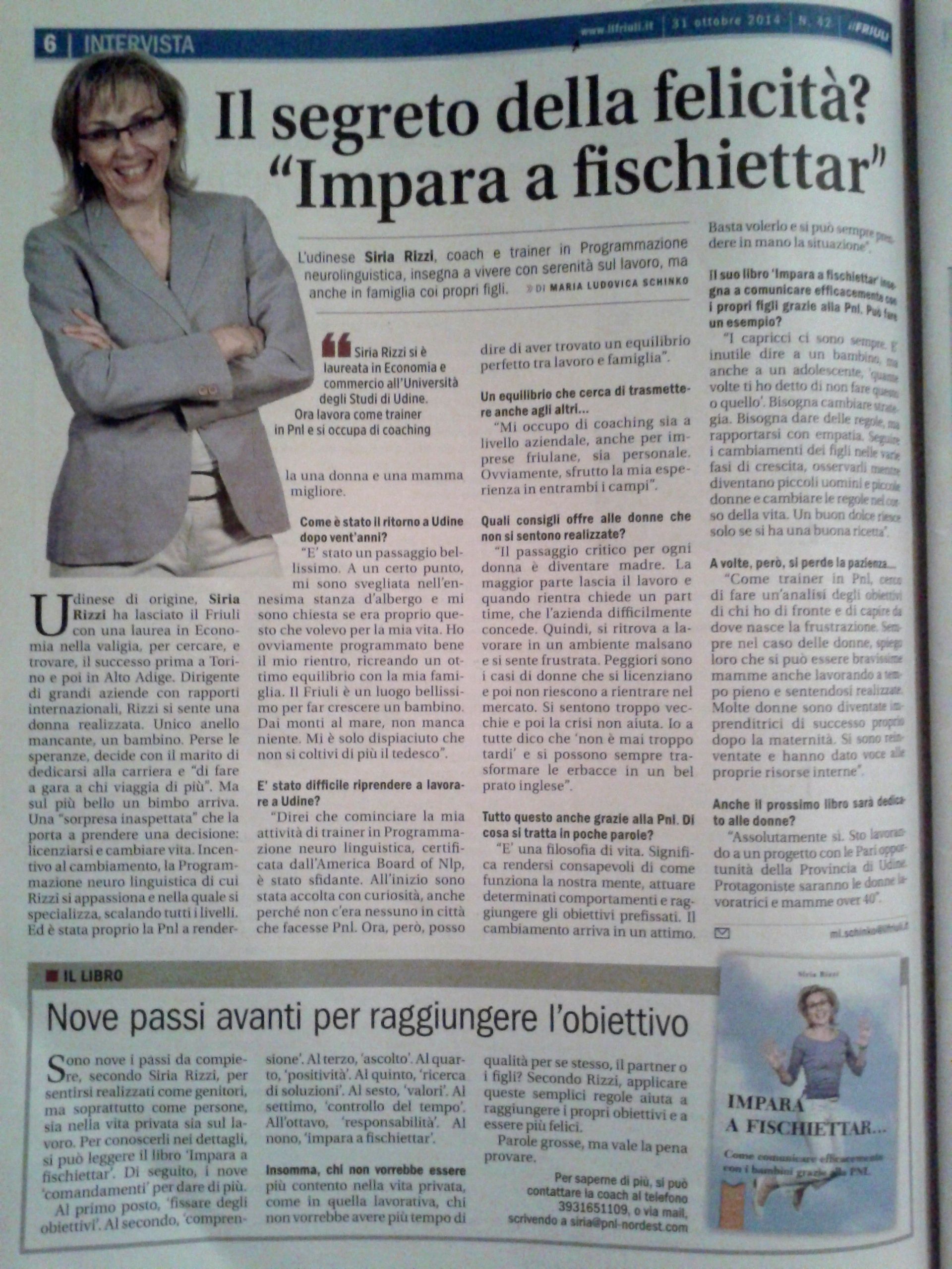 Tornata in Italia mi dedico appieno all’organizzazione della mia nuova attività con lo scopo di far conoscere questa PNL pulita, efficace, sincera, profonda all’Italia e in primis alla mia regione di origine: il Friuli Venezia Giulia. Con la famiglia mi trasferisco di nuovo nella mia città natale, Udine. Nasce il mio primo libro dedicato a tutti gli adulti che hanno a che fare con bambini: “Impara a fischiettar… come comunicare efficacemente con i bambini grazie alla PNL”. Un libro-corso che offro alle persone prima di partecipare ai miei corsi di comunicazione con i bambini, e che dà tutte le soluzioni che ho messo in pratica in persona e che garantisco che funzionano. E’ un libro che getta le basi per ogni tipo di comunicazione efficace non solo con i bambini, ma anche con il/la partner, i familiari, i colleghi, i superiori, ecc. Un libro che vuole emozionare e responsabilizzare per percorrere il cammino verso l’eccellenza. La mia missione.